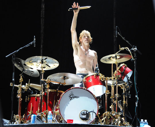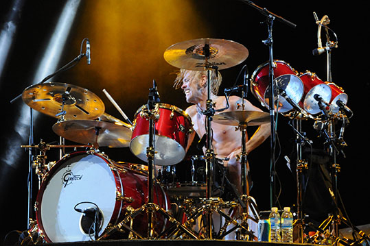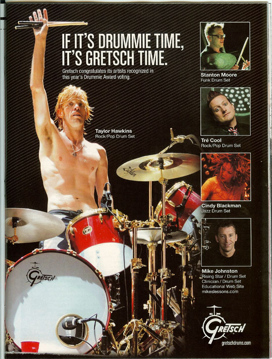 Gretsch, the company who produce and provide Taylor Hawkins’ drum kits, recently bought a couple of photographs of Taylor which I took in Buenos Aires, South America this past April. They will appear in some upcoming Gretsch advertisements in various magazines. The first is currently in August’s edition of DRUM! magazine as Taylor won the Best Rock/Pop drummer of the year award. I was very excited to see my image in there and happy T won the award over his other competitors. Very well deserved. Image in question and magazine scan are below.