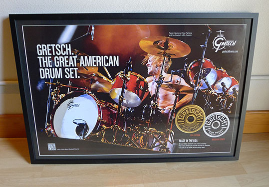 Gretsch have used another one of my photos for a Gretsch/Taylor Hawkins advert. This time it is running over consecutive months as a full spread ad in both DRUM! magazine and Modern Drummer publications. What was also cool was Gretsch framed 2 copies of the ad and mailed it to the Studio as a gift for Taylor. I was very kindly given one and then the other one will go up in the studio for all to see.