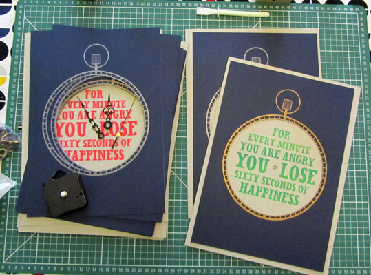 They’re functioning clocks I screen printed at Print Club London. If anyone is interested in buying one, let me know! They’re limited to a signed series of 10 in each colour. Pink and silver or green and bronze, A4 size, £20 each. See the printmaking section of my site for the finished article or message me for more details.